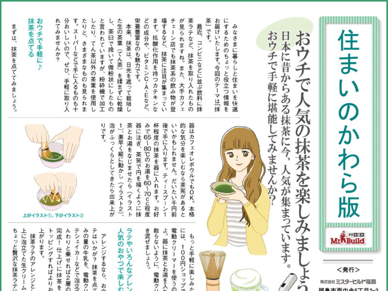 今月のかわら版は「おウチで人気の抹茶を楽しみましょう!」です。 日本に昔からある抹茶に今、人気が集まっています。おウチで手軽に堪能してみませんか? 住まいの快適レポートは「印象に残るショットを狙うカメラ活用法」についてお送りいたします。
