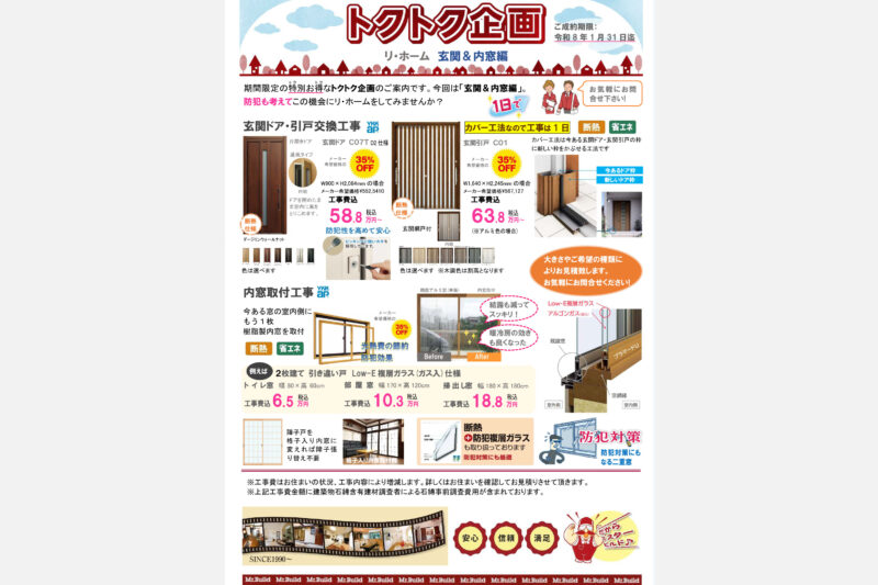 期間限定の特別お得なトクトク企画のご案内。 今回は「玄関&内窓編」。この機会にリフォームしてみませんか? トクトク有効期限:2024年1月31日迄