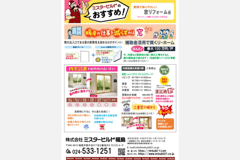 ミスタービルド福島では、国の「先進的窓リノベ事業2026」を活用した窓の断熱リフォームをご提案しています。